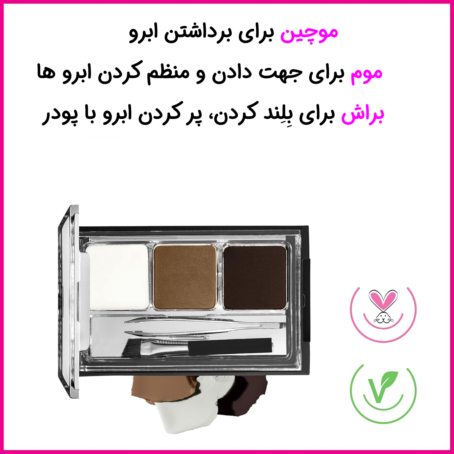 شامل دو رنگ سایه پودری (قهوهای روشن و تیره) و وکس شفاف، که مناسب انواع تناژ پوستی است و به شما امکان میدهد ابرویی طبیعی یا شکیل بسازید.